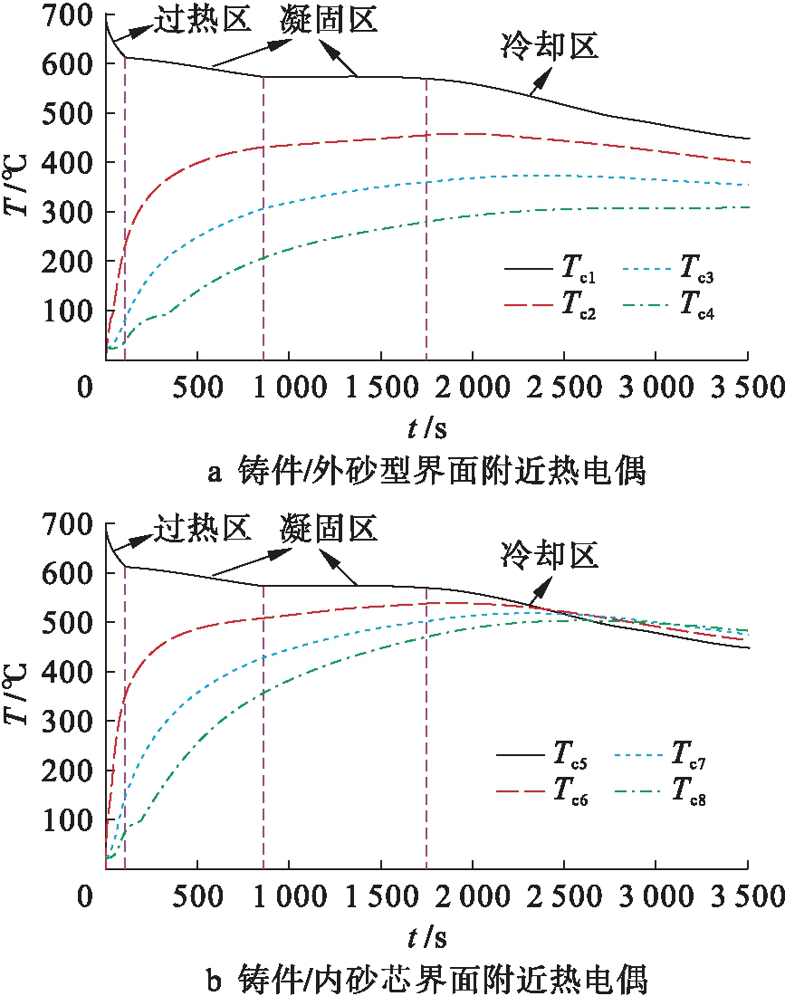 图4为典型ZL101合金环形铸件测温试验中热电偶测试温度随时间的变化曲线,其中合金的浇注温度为680 ℃,砂型和砂芯的初始温度均为25 ℃,热电偶Tc1、Tc5的测试曲线分别表征铸件/外砂型和铸件/内砂芯的界面温度.由图4可见,约120 s后金属液的过热温度被消除,冷却曲线斜率明显变化,这表明合金开始凝固,约850 s后合金达到共晶成分进行共晶凝固,约1 750 s后凝固过程结束,铸件冷却速率增加.观察图4可以发现,内砂芯和外砂型的温度场变化相差很大,整个过程中外砂型温度均低于铸件温度,而内砂芯温度约在2 500 s后逐渐高于铸件温度.此外,Tc4、Tc8温度曲线约在100 ℃前产生曲折现象,这可能是由于砂型(芯)内部残留的水分在受热过程中以水蒸汽形式渗透出去,从而吸收一定热量,导致其温度曲线有所偏离[8-9].