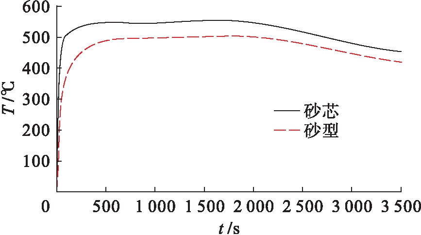 砂型和砂芯表面1号单元的温度如图6所示.由图6可见,反算出的外砂型和内砂芯的表面单元温度在120 s之前急剧上升,这阶段金属液处于过热区,铸型和金属液温差很大,产生很大的界面热流使得铸型温度快速上升,且这段时间砂芯表面温度比砂型上升更快,可以归因于初期砂芯的界面热流大于砂型界面热流.经历金属液过热区后,砂型和砂芯两者表面温度变化趋势十分接近,其温度上升速率逐渐降低,约1 750 s后铸件潜热释放完全,砂型和砂芯表面温度达到最高值随后温度平稳下降,且二者温差也逐渐减少,其根本原因是两者热流都在逐渐减少.