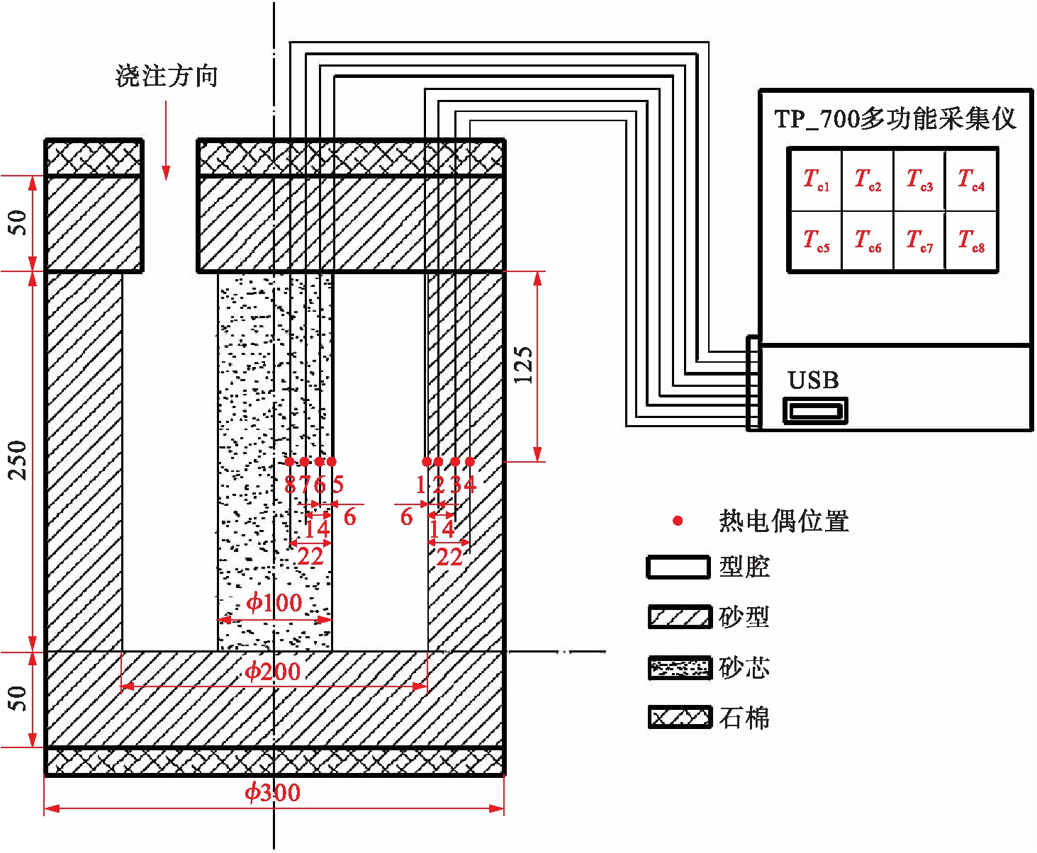 待测温试验装置准备妥当后,采用ZL101合金用井式电阻炉进行熔炼,完成精炼脱气和除渣后,将合金液浇入测温试验装置中.待铸件凝固冷却完毕后,从数据采集仪上获得所需温度数据.