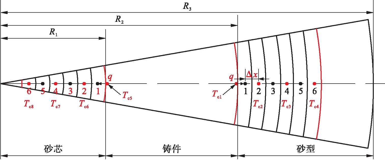 在铸件/外砂型界面处的热流值已确定的情况下,可利用由式(2)~(6)形成的矩阵方程组,通过追赶法对矩阵求逆计算砂型的瞬态温度场.同理,铸件/内砂芯温度场数理模型的建立方法与环件外砂型方法相同,只是由于单元的建立顺序是从铸件/砂芯界面位置为起始单元依次排列,因而其几何函数需更换成式(7).