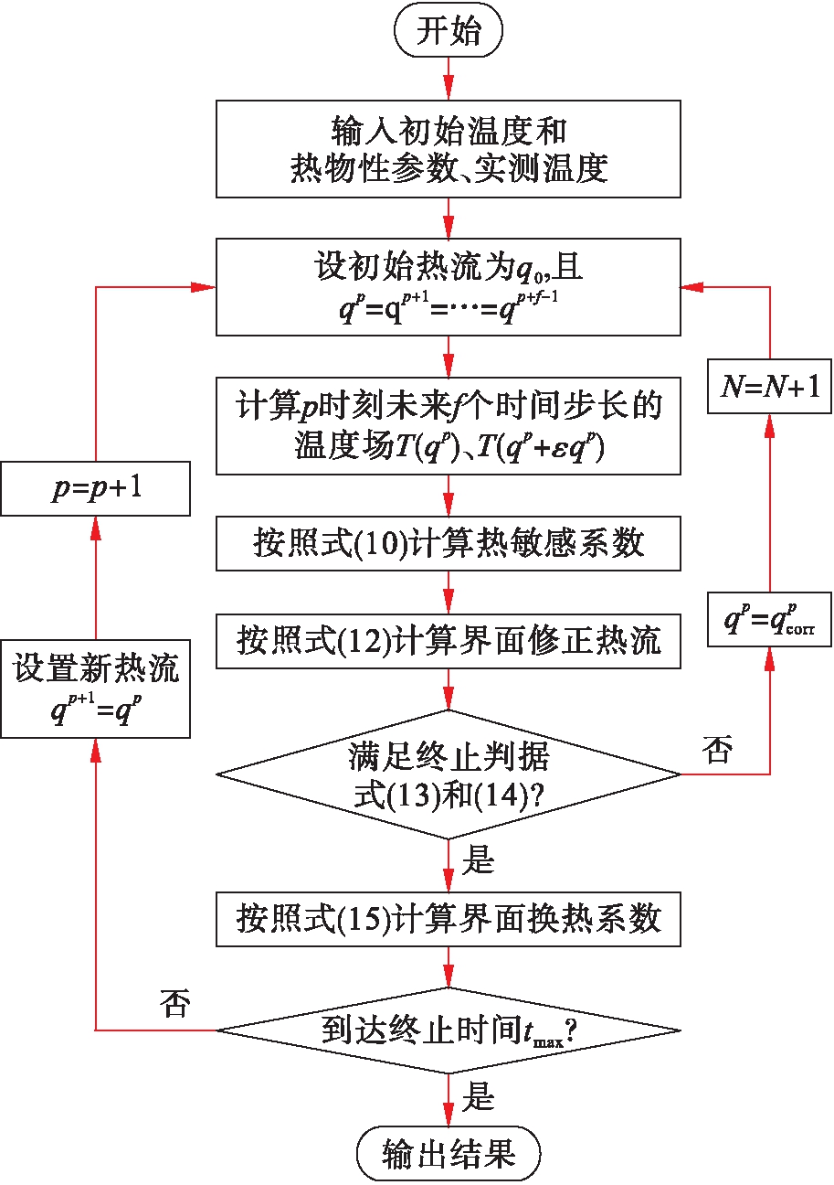 求解界面换热系数时,需要结合Beck提出的非线性估算方法确定热流值.本文以求解铸件/砂型的界面换热系数为例进行说明,求解界面热流和界面换热系数的流程如图3所示.当采用非线性估算法求解p时刻的热流qp时,为了减少测量温度所造成的误差,假设p时刻与其未来f个时间步长的热流值相等,且都等于热流初始值q0,从而对热流进行分段处理,即