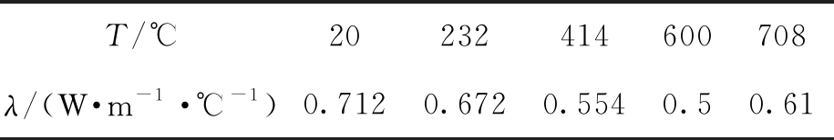 为使反算结果更精确,材料的热物性参数需要考虑温度变化.树脂砂的热物性参数可从ProCAST软件中的Material Database数据库中获得,砂型密度(ρ=1 590 kg/m3)保持不变,对未知温度下的热物性参数运用多段线性插值法获得导热系数λ和等效比热容CP,其随温度的变化分别如表1、2所示.