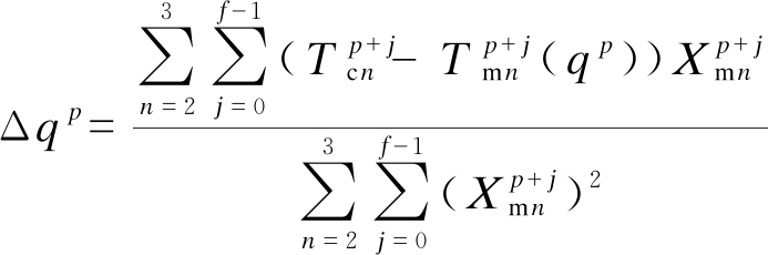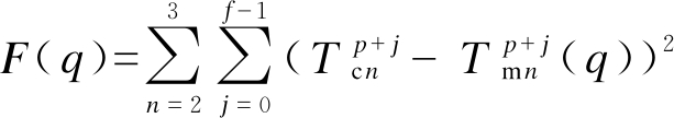 利用[t p,t p+f]时间段内2号和3号热电偶的测量温度Tcn(n=2、3)与计算温度Tmn(q)建立最小二乘法目标函数,其表达式为