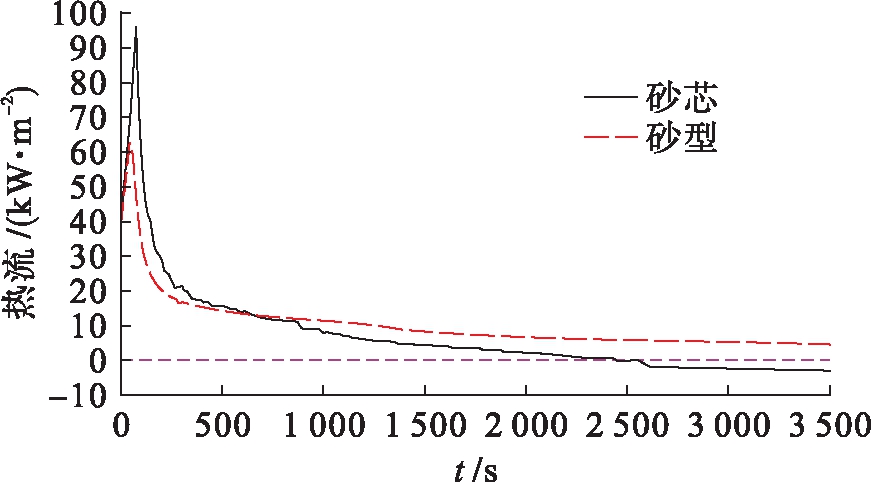 图5 外砂型、内砂芯与铸件界面的瞬态界面热流