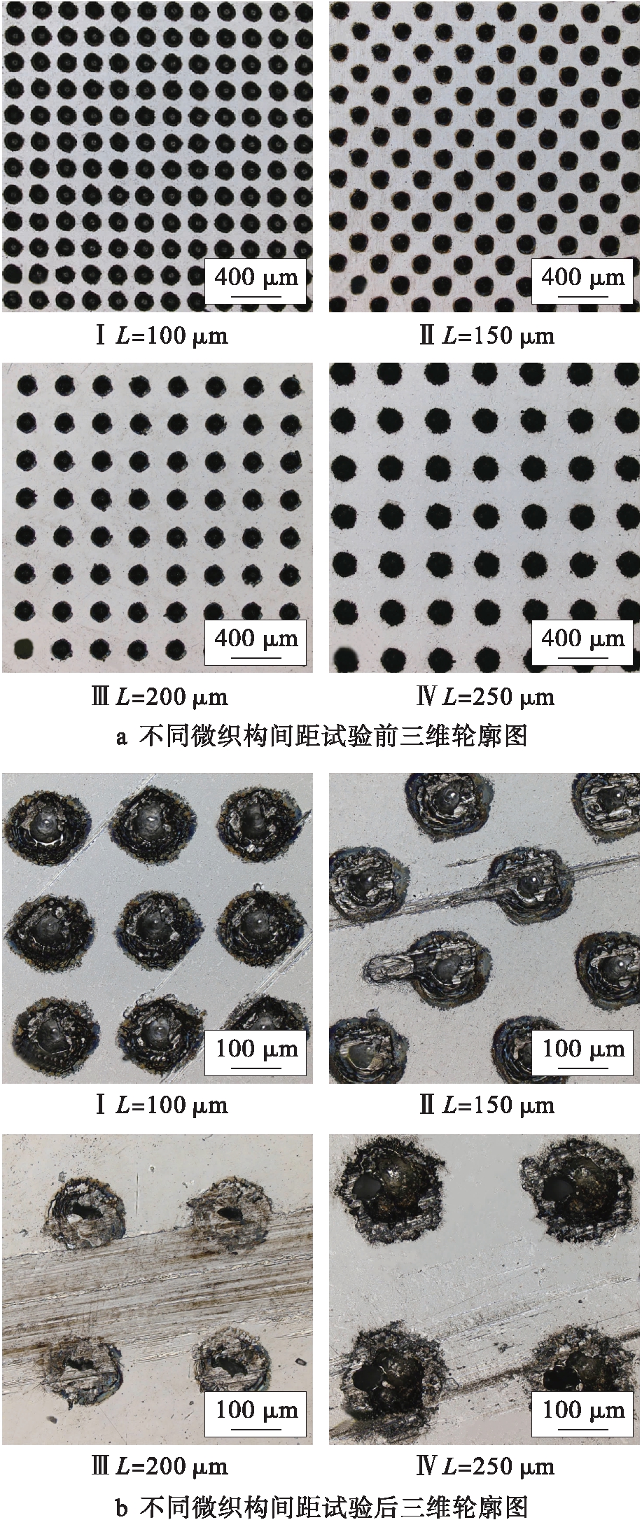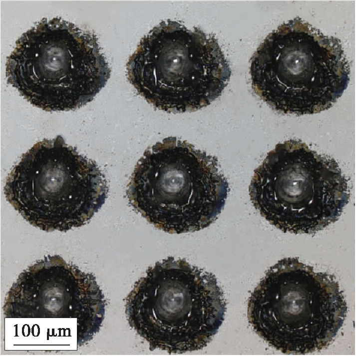 金刚石抛光液;再通过超声滚压技术(USRP)对试件表面进行强化,表面显微硬度值经测定约为340 HV;最后采用激光加工技术,使用YAG激光器加工系统在下试件钢盘表面进行微织构加工.微织构表面显微硬度值经测定约为343 HV,与未加工面相同,这表明激光织构化对表面硬度几乎没有影响.同时对表面织构尺寸及形貌进行表征,如图3所示,分别制备了直径为80、120、160、200和240 μm的微织构,间距约为150 μm,深度约为20 μm.间距分别为100、150、200、250和300 μm的微织构,直径约为120 μm,深度约为20 μm.微织构截面图如图4所示.