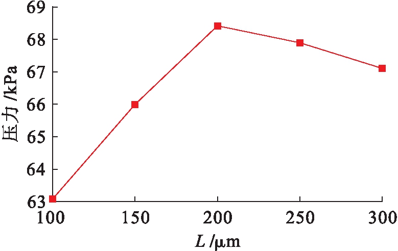 图10为不同间距微织构油膜的最大压力值变化.由图10可知,油膜最大压力值最优参数为间距L=200 μm.间距L小于200 μm时,随着间距L的增加,油膜的最大压力值增加,动压效果明显,润滑性能提升.当间距L大于200 μm时,随着间距L的增加,油膜的最大压力值减小,动压润滑效果减弱,润滑性能变差.因此,当直径D为120 μm,深度H为20 μm,间距L为200 μm时,动压润滑效果最明显,润滑性能最好.这是因为织构间距过小,不利于形成有效的油膜,使摩擦副处于边界和混合润滑状态.织构间距过大会导致织构面密度减小,润滑性能下降.