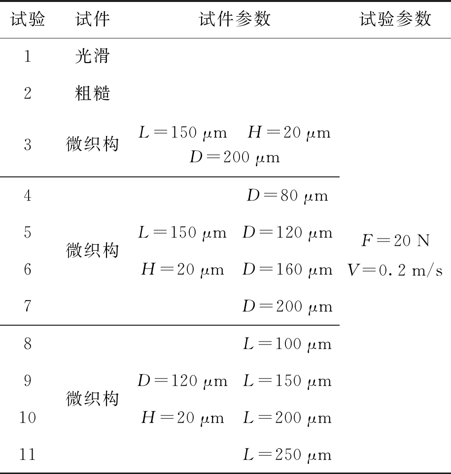 为了研究不同微织构参数对润滑性能的影响,本文进行了相关摩擦磨损试验,试验设计如表1所示,其中,F为上试件的下压力.