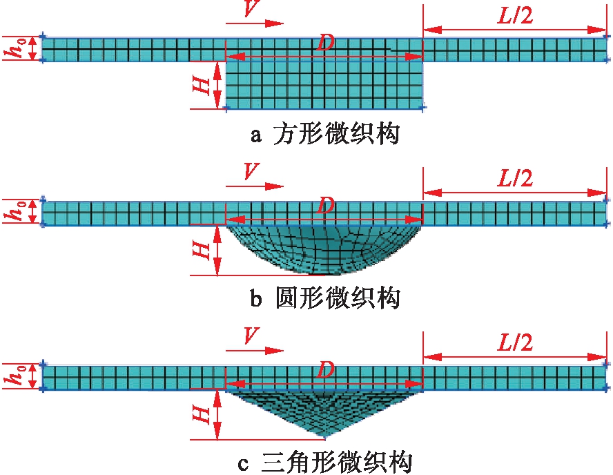 在关节轴承上加工微织构,由于单个织构尺寸很小,所取尺寸的曲率可以忽略不计,因此可以将其简化成平面,近似看作直线运动.采用Gambit 2.3.16分别建立方形微织构、圆形微织构与三角形微织构模型,如图1所示.图1中,L为微织构间距,V为上壁面相对下表面的运动速度,h0为油膜厚度,D为微织构直径,H为微织构深度.