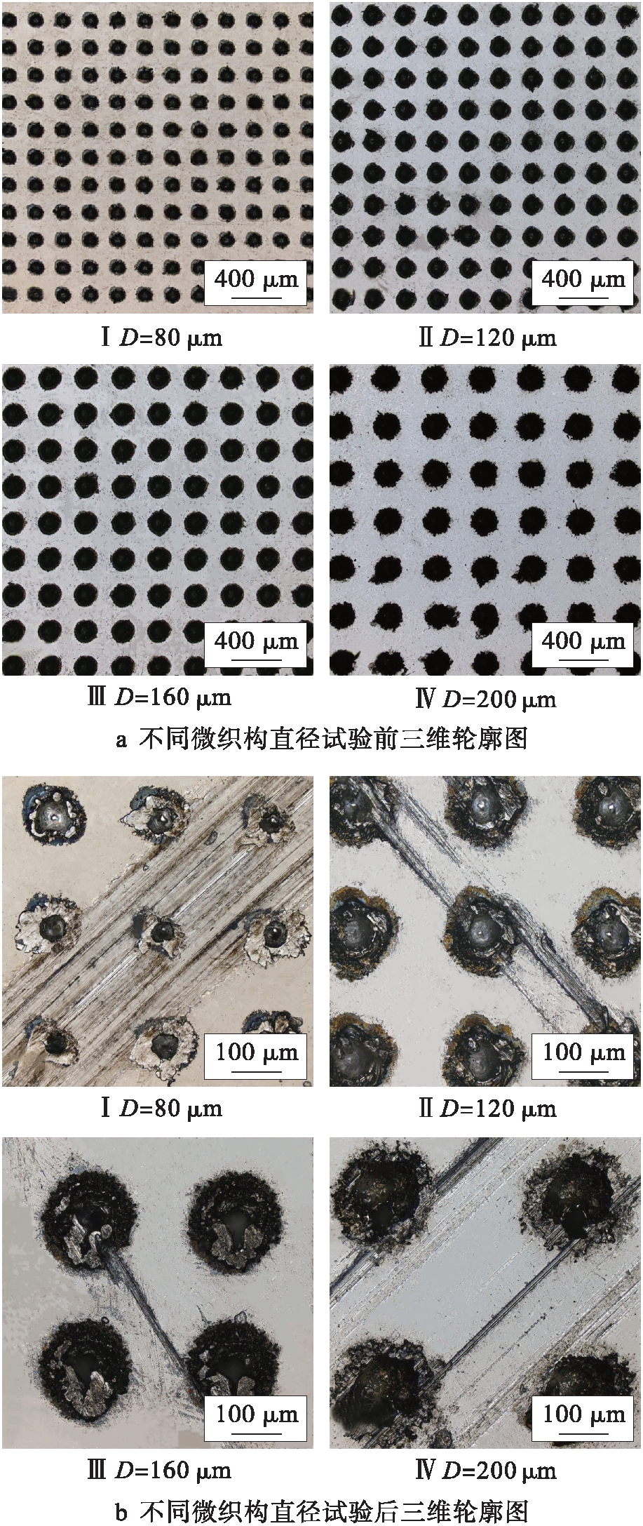 图13为微织构试验前后的三维轮廓图.由图13可以看出,微织构直径小的磨斑呈现较深较宽的沟槽状,直径大的微织构有较轻的磨损.从磨斑形貌来看微织构磨损是由于犁沟和黏着所致,磨屑存留在微坑内,这表明微坑在摩擦过程中起到了捕获磨屑的作用,从而减少了磨粒磨损.