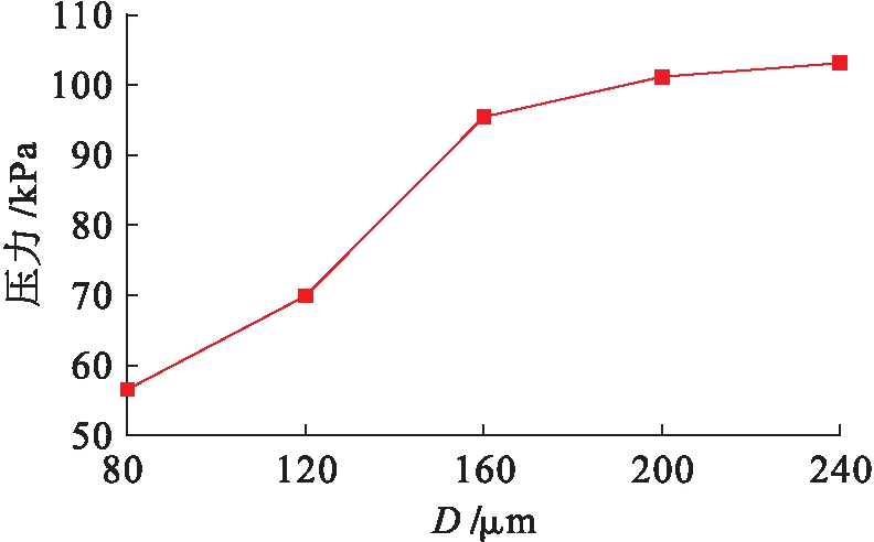 微织构的间距L=150 μm,深度H=20 μm,油膜厚度h0=10 μm,直径分别为80、120、160、200和240 μm,研究不同直径下圆形微织构对摩擦副润滑性能的影响.不同直径微织构的压力分布云图如图7所示.图8为不同直径微织构的最大压力图.由图8可以看出,随着微织构直径的增加,最大压力值随之增大,动压润滑效果显著,油膜压力逐渐增大,润滑性能越来越好,摩擦磨损变小.
