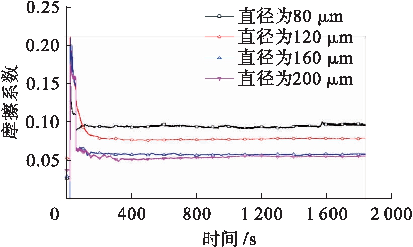 图11为在载荷20 N、速度0.2 m/s的贫油润滑条件下,不同直径微织构的摩擦系数变化曲线.由图11可以看出,织构面摩擦系数均在0.05~0.1之间.随着载荷及速度增加,各织构面摩擦系数迅速增加;随着载荷和速度达到恒定值后,摩擦系数稳定在某个值上下波动.同时可以看出,随着织构直径的增加,摩擦系数逐渐减小.图12为摩擦系数随直径变化曲线.由图12可以看出,微织构直径在80~160 μm时,摩擦系数急剧减小,直径在160~200 μm时,摩擦系数缓慢减小.