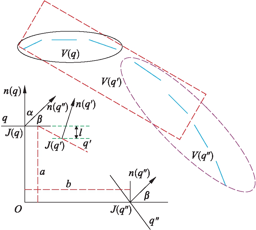 用α表示n(q)的方向角,用β表示n(q″)的方向角,用γ表示n(q′)的方向角,则有