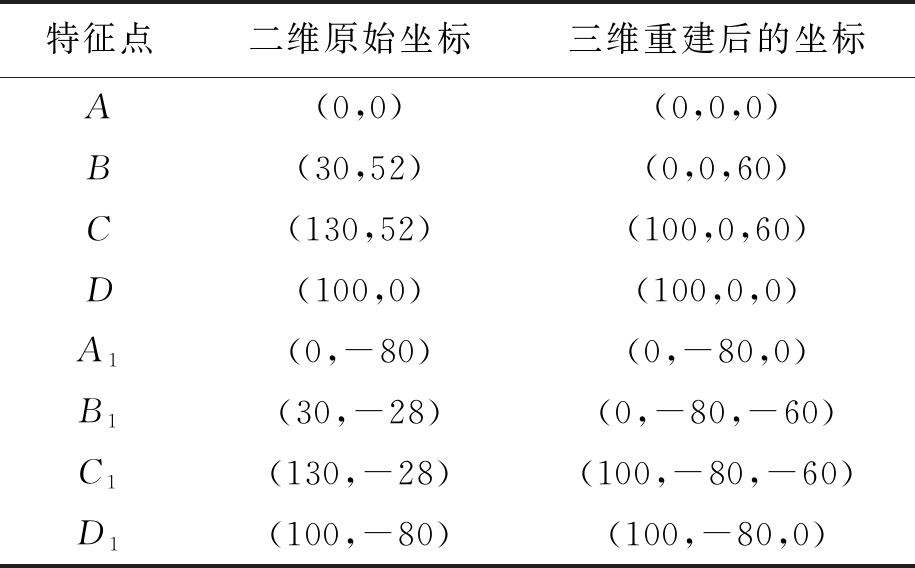 特征点二维原始坐标三维重建后的坐标A(0,0)(0,0,0)B(30,52)(0,0,60)C(130,52)(100,0,60)D(100,0)(100,0,0)A1(0,-80)(0,-80,0)B1(30,-28)(0,-80,-60)C1(130,-28)(100,-80,-60)D1(100,-80)(100,-80,0)