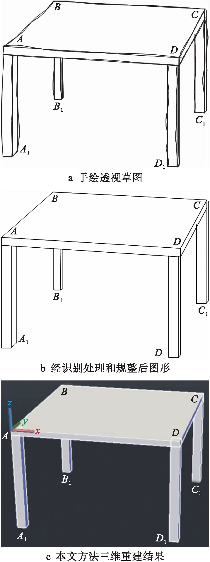 实验在CAID软件下进行,对本文方法进行实验验证.图3为椅子的建模实例.图3a为设计师手绘的透视草图,图3b为经识别处理及规整后图形,图3c为经本文方法得到的三维模型重建结果.透视草图中各特征点的坐标如表1所示.