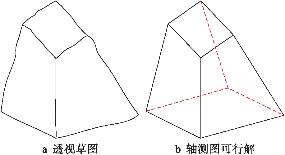 在进行工业产品设计的过程中,特别是对构形进行设计时,一般通过趋近正等轴侧投影图的透视草图形式进行描述.在构形时绘制的线条大部分是消隐的轴测图,如图1a所示,其和通常所见的图形中最接近的可行解用图1b进行描述.所以将封闭的各面片当成三维模型重建的关键,在CAID软件下逐步完成透视草图相应形体的三维重建.