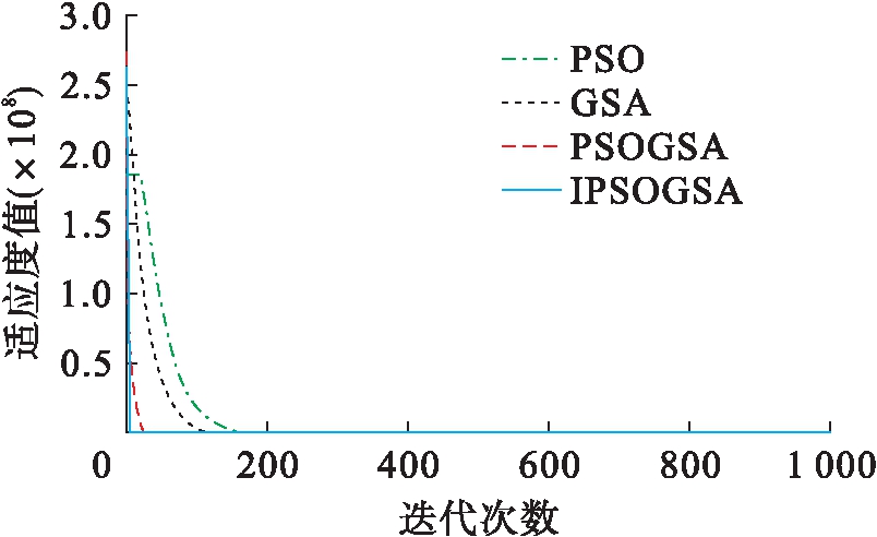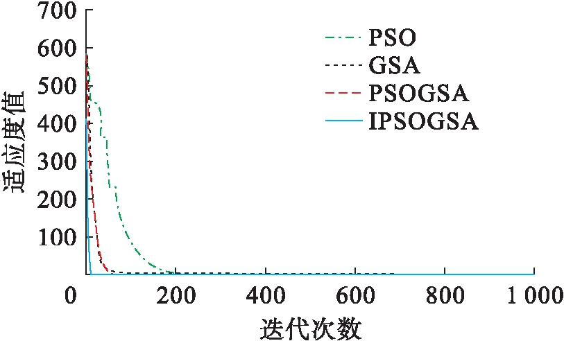 利用改进的PSOGSA混合算法、PSO算法、GSA算法以及基本PSOGSA算法对上述四个测试函数进行数值实验来验证本文算法的性能.各算法涉及的主要参数设置如下:种群规模N=50;最大迭代次数T=1 000;函数维度d=30;标准粒子群算法中惯性权重w=0.9;加速因子c1=2,c2=2;万有引力算法中引力常数G0=100;PSOGSA混合算法中加速因子c1=0.5,c2=1.5.为了验证改进粒子群万有引力混合算法的优越性和可行性,分别对表1所示的四个函数进行优化,如图1~4所示.