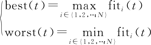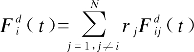 式中:fiti(t)为粒子i在t时刻的适应度函数值;worst(t)为粒子i在t时刻群体最差适应度函数值;best(t)为粒子i在t时刻群体最好适应度函数值.第d维空间上粒子i所受到的总作用力为
