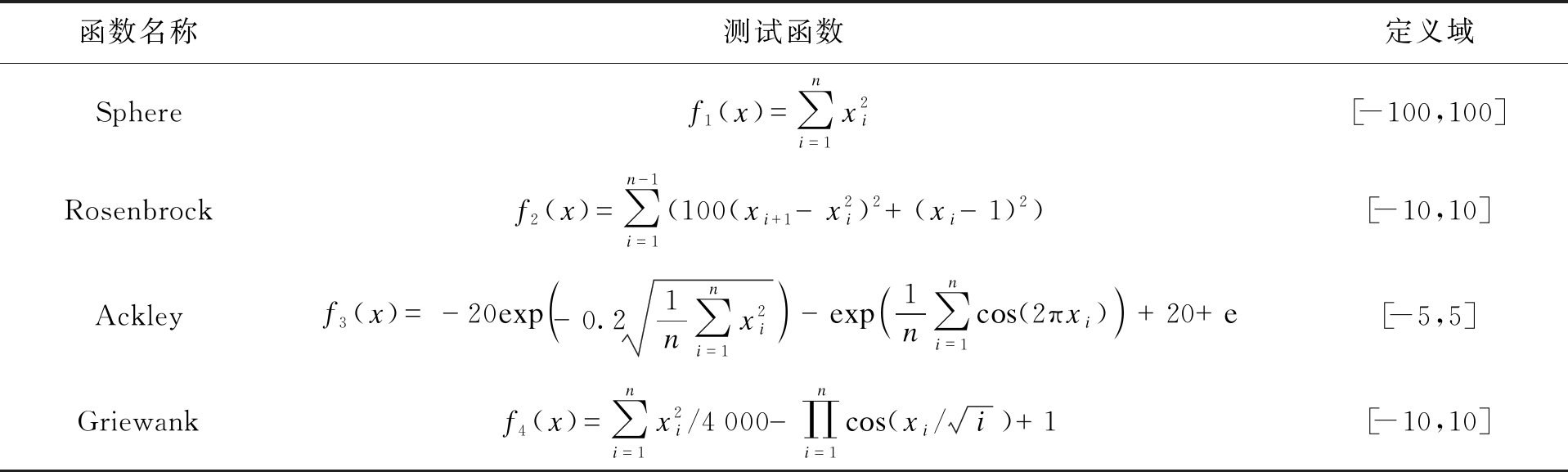 函数名称测试函数定义域Spheref1(x)=∑ni=1x2i[-100,100]Rosenbrockf2(x)=∑n-1i=1(100(xi+1-x2i)2+(xi-1)2)[-10,10]Ackleyf3(x)=-20exp-0.21n∑ni=1x2i -exp1n∑ni=1cos(2πxi) +20+e[-5,5]Griewankf4(x)=∑ni=1x2i/4000-∏ni=1cos(xi/i)+1[-10,10]
