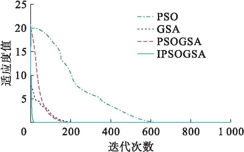 为了检验改进的PSOGSA混合算法的优化效果,选取了PSO、GSA和基本PSOGSA算法进行对比实验,并引入四个Benchmark函数进行测试.四个测试函数中,Sphere是一个非线性的、平滑的、对称的单模态函数,变量间可分离,常用来分析算法的执行性能;Rosenbrock是一个非对称的典型病态单模态函数,很难实现全局最优;Ackley和Griewank均为典型的不同维度之间不可分离的、连续的复杂多模态函数,两者均具有广泛的搜索空间,以及大量的局部极小点和高大的障碍物.在这四个函数中,除了Rosenbrock函数在全局最优解[1,1,…,1]处有极小值,其余测试函数均在全局最优解[0,0,…,0]处有极小值,并且极小值均为0.具体函数如表1所示.