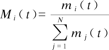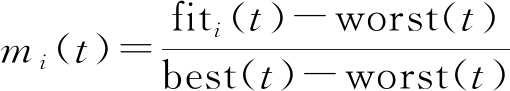 在GSA算法中,为了简化模型,假设引力质量与惯性质量相等,而粒子的惯性质量是依据其适应度的大小计算的,那么粒子的适应度越好,则该粒子的惯性质量越大,吸引力也越大,越接近最优值,但是其移动速度却越慢.根据适应度函数得出的粒子引力质量的更新算法表达式为
