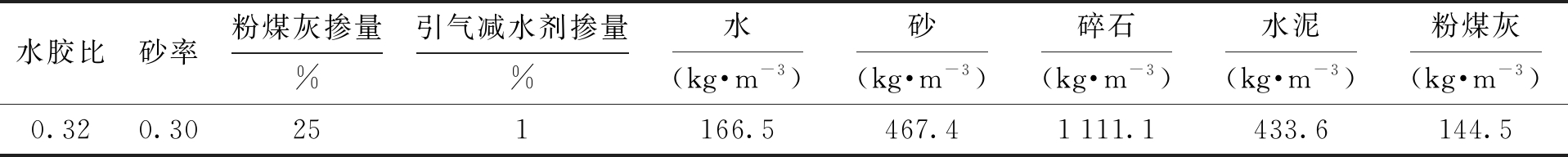 水胶比砂率粉煤灰掺量%引气减水剂掺量%水(kg·m-3)砂(kg·m-3)碎石(kg·m-3)水泥(kg·m-3)粉煤灰(kg·m-3)0.320.30251166.5467.41111.1433.6144.5