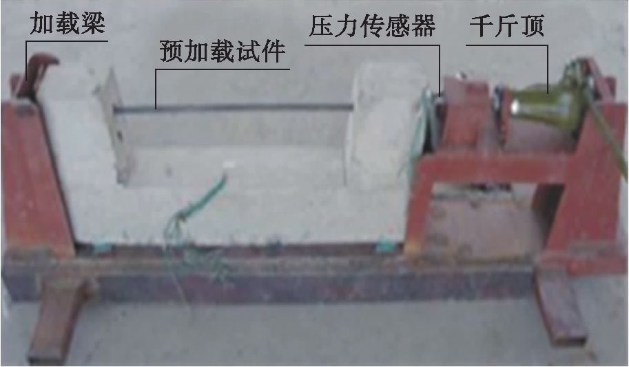 在加载位置预先穿好一根直径为20 mm的高强钢筋,并在钢筋的两端预先制作好螺距并确定与之相匹配的螺母.用千斤顶加载,加载速率为0.3~0.5 N/s,通过压力传感器读数,达到预定值后,将事先准备好的内径为20 mm的螺母拧紧在圆钢筋上,以此预加荷载.本文试验共分为三组,第一组不加载也不进行冻融;第二组加载12.5 kN;第三组加载12.5 kN并进行冻融循环试验.冻融循环试验中冷冻温度保持在-15~-20 ℃,1次冻融时间不小于12 h,冷冻和融化时间比不少于4∶1,冻融循环次数为125次,每冻融循环25次进行称重,观测质量变化,至125次冻融结束,未发现质量有明显变化.之后对三组构件同时进行加载破坏试验.试验装置如图2所示,试验结果如表3所示.
