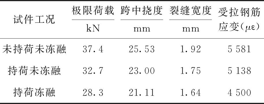 试件工况极限荷载kN跨中挠度mm裂缝宽度mm受拉钢筋应变(με)未持荷未冻融37.425.531.925581持荷未冻融32.723.001.755138持荷冻融28.321.111.644500