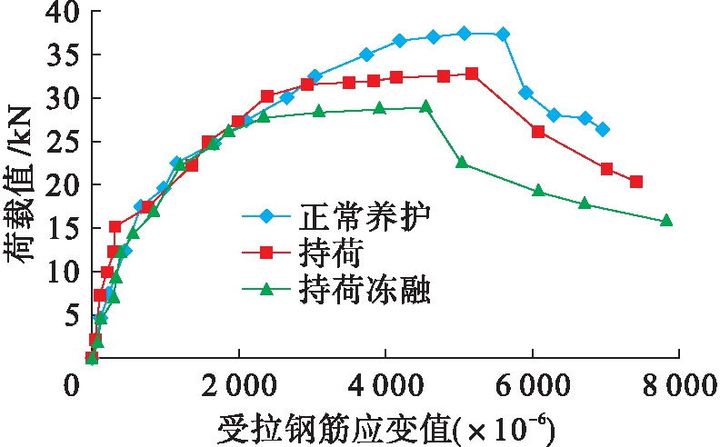 图5为受拉区纵向钢筋的荷载应变关系曲线.由图5可以看出,当混凝土构件达到极限荷载时,持荷与冻融耦合作用下的受拉区钢筋应变值最小.产生上述现象的原因是:持荷冻融耦合作用下的钢筋混凝土压弯构件,受压区混凝土由于内部损伤较未持荷未冻融和持荷未冻融等两种工况下的混凝土压弯构件严重,这就相当于受压区的混凝土强度降低,从而发生钢筋未屈服,受压区混凝土被压碎的试验现象,类似于超筋破坏.