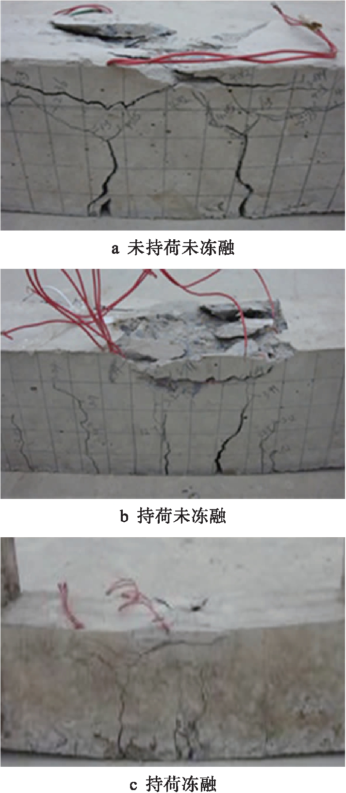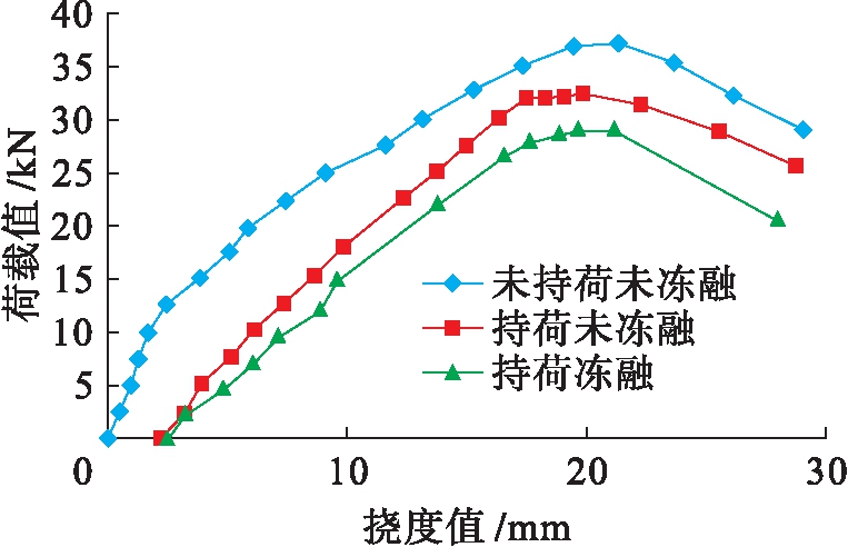 通过表3中的极限荷载值可以看出,持荷未冻融和持荷冻融工况下的极限荷载较未持荷未冻融工况下的极限荷载分别降低了14.4%和24.3%.这是由于混凝土是一种多相复合材料,在凝结过程中,水泥砂浆中的一些水分会蒸发,使得水泥凝胶体出现收缩变形,当应力达到一定程度,就在表面形成微小的裂缝,在持续荷载作用下这些微小的裂缝将会逐渐变大,从而影响构件的承载力.混凝土的毛细孔水在0 ℃以下发生形态变化,由水变成冰,体积膨胀,因受到毛细孔壁约束形成膨胀压力,从而在孔周围的微观结构中产生拉应力,当混凝土受冻时这种压力会损伤混凝土内部的微观结构,反复多次冻融循环以后,损伤积累就会不断扩大,影响混凝土的抗压强度,进而影响构件的承载力.