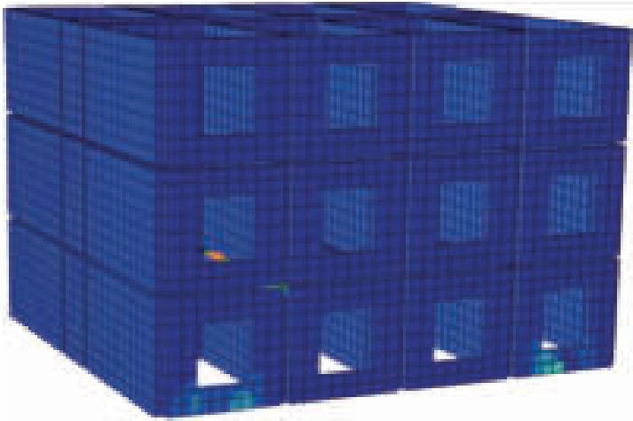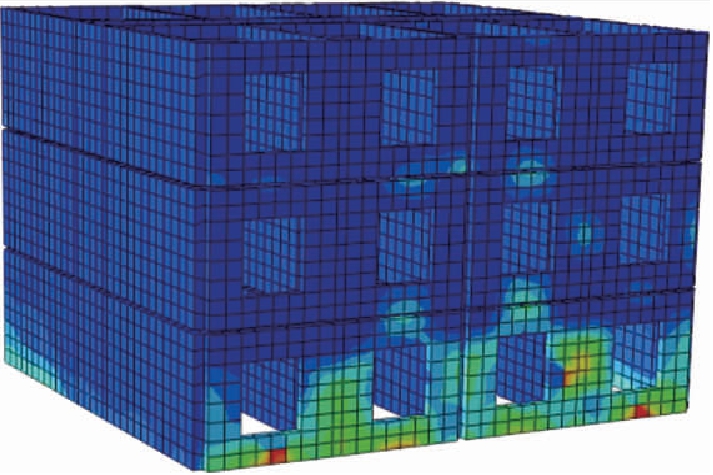 当结构按89规范设计时,小震和中震时结构基本完好,而大震时上部砌体层裂缝开展情况和底框粘土砖墙裂缝如图19、20所示.超大震时上部砌体层裂缝开展情况和底框粘土砖墙裂缝如图21、22所示.当底框砌体结构按10规范设计时,小震时结构基本完好,中震时发生轻微破坏,而大震时上部砌体层裂缝开展情况和底框混凝土墙裂缝如图23、24所示.超大震时上部砌体层裂缝开展情况和底框混凝土墙裂缝如图25、26所示.通过对比可知,超大震时裂缝开展和结构破坏更严重,粘土砖墙耗能能力差,导致底框部位刚度下降迅速,墙体容易倒塌,容易发生坐层现象,因此,10规范规定宜使用混凝土抗震墙,这与按照层间位移角和层间刚度比分析的结果基本一致.