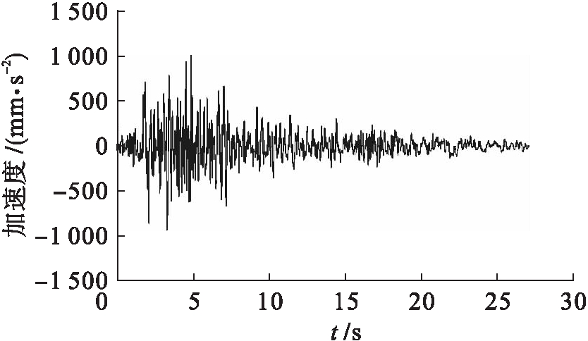 根据本文工程结构的设计特点,选用适用于Ⅱ类场地的Taft地震动进行分析(见图17).按照10规范,结构在进行弹塑性时程分析时,只需要进行水平两个方向的地震动输入.实际上,在汶川地震中地面竖直方向的地震加速度也很大,因而本文在弹塑性分析时采用三向地震动输入,进行超大、大、中、小地震下的弹塑性时程分析,且X、Y、Z三个方向的地震动幅值比例为1∶0.85∶0.65.