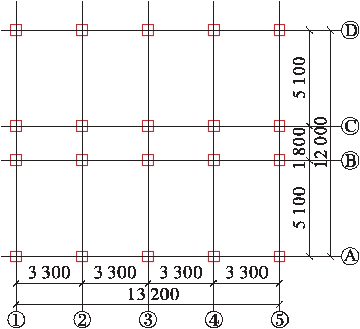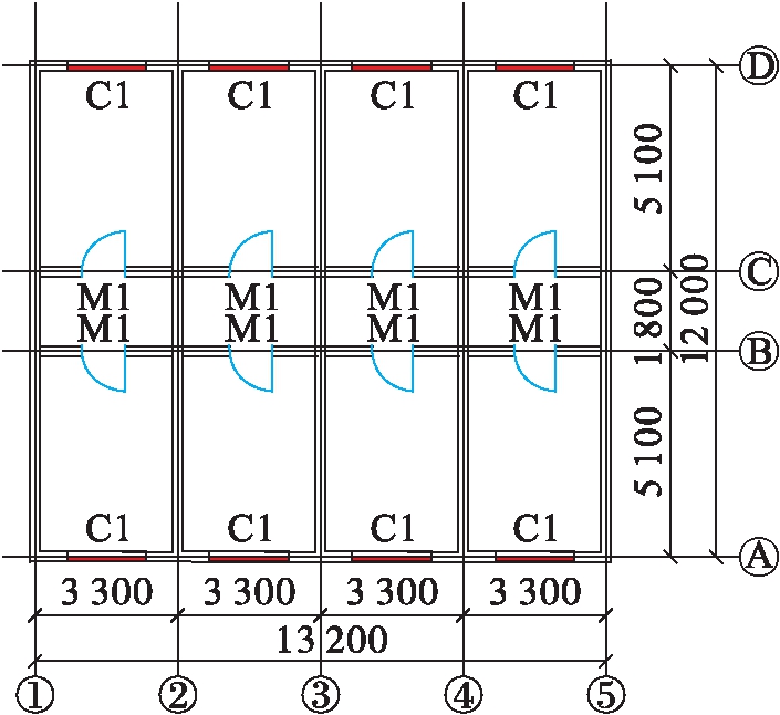 选择一栋4层临街建筑为原型建立计算模型,该房屋底部一层为框架形式,层高为4.5 m,框架柱截面尺寸为0.4 m×0.4 m,框架纵梁截面尺寸为0.3 m×0.4 m,框架横梁截面尺寸边跨为0.3 m×0.6 m,中间跨为0.3 m×0.4 m;上部3层为砌体形式,砌体墙厚内外均为0.24 m,层高为3.3 m.该工程结构归于7度抗震设防烈度,基本地震加速度值为100 gal,最大设计使用年限为50年,建筑结构安全等级为二级,设计地震分组为第一组,建筑物抗震设防分类为丙类建筑,建筑场地类别为Ⅱ类场地.上部楼层砌块均采用MU10普通黏土砖和M10砌筑砂浆.构造柱、底框层墙及柱的混凝土强度等级为C30.房屋的平面布置如图2、3所示(单位:mm).