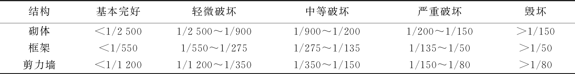 结构基本完好轻微破坏中等破坏严重破坏毁坏砌体<1/25001/2500~1/9001/900~1/2001/200~1/150>1/150框架<1/5501/550~1/2751/275~1/1351/135~1/50>1/50剪力墙<1/12001/1200~1/3501/350~1/1501/150~1/80>1/80