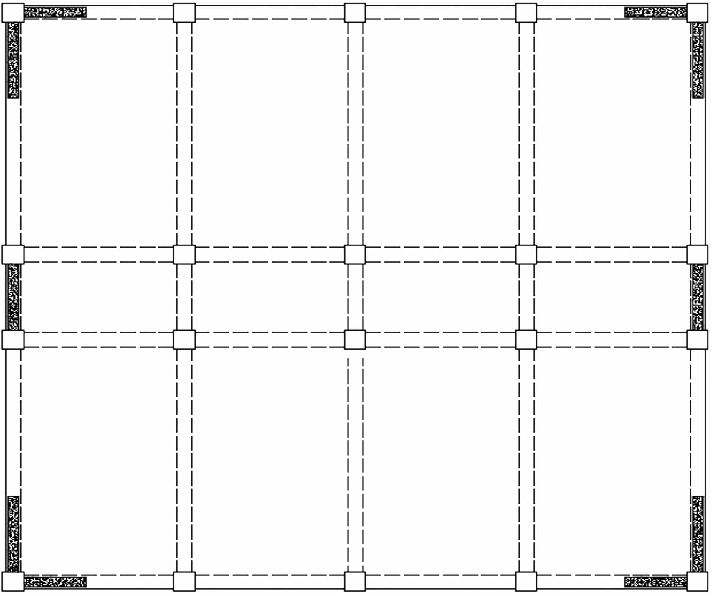 根据89规范第7.1.4条[10]规定,底层框架砖房的底层应沿纵横两方向对称布置一定数量的抗震墙,且第二层与底层侧移刚度的比值在7度抗震设防烈度下不应大于3,抗震墙在7度抗震设防烈度下可采用嵌砌于框架之间的粘土砖墙.本文设计方案底层按此规定选用嵌砌于框架之间的粘土砖墙,墙体布置如图4所示.根据89规范第7.3.1条规定布置构造柱(见图5),其截面尺寸为240 mm×240 mm.