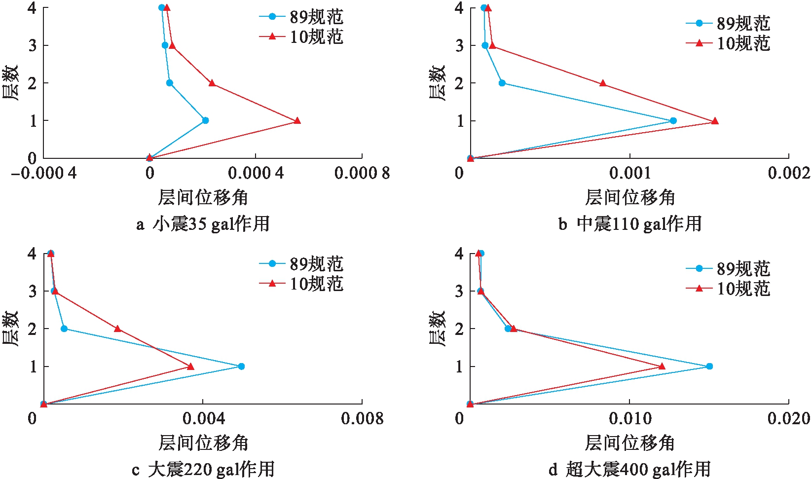 为研究不同地震动幅值下结构的破坏状态及抗震性能,需要对地震动进行调幅,根据10规范第5.1.2条规定的时程分析所用地震动时程最大值表可知,7度抗震设防烈度下小震、中震、大震和超大震的加速度峰值分别对应35、110、220和400 gal.采用上述分析模型分别对由不同版本规范设计的底框砌体结构房屋进行弹塑性时程分析,得到不同地震动强度下底框砌体结构各层的最大层间位移角(见表1)以及相应的层间位移角变化折线图(见图18).
