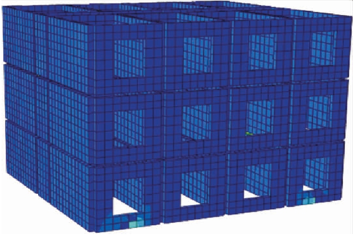 采用大型通用有限元软件ABAQUS建立实体单元进行有限元模拟.框架柱、框架梁、普通黏土砖墙和钢筋混凝土抗震墙采用Solid单元(C3D8R)进行模拟,钢筋采用Truss单元进行模拟.底层框架梁、柱中钢筋分布如图8所示.砌体是由砖和砂浆砌筑而成的二相复合材料,本文对其进行有限元分析时采用整体连续式模型.整体连续建模是将砖和砂浆作为一个整体综合考虑砖和砂浆的作用,避免了离散建模连接处存在的难点,减小了计算规模,适用于整体结构分析.底框砌体结构上部砌体部分的有限元模型如图9所示.若只考虑楼板弹性性质,不考虑其塑性性质,则ABAQUS结构整体有限元模型如图10、11所示.