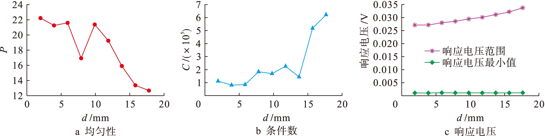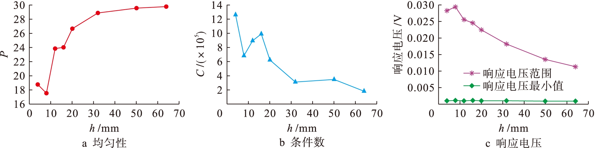 由图2可以看出:敏感场的均匀性会随着电极宽度的增加而有所改善,但为获得较小的灵敏度矩阵条件数和较小的测量电压范围,电极宽度不能过宽.由图3可以看出:敏感场的均匀性会随着电极长度的增加而变差,但灵敏度矩阵的条件数和响应电压范围却随着电极长度的增加而显著降低.综上电极的宽度和长度取值不宜过大或过小,为此设定它们的取值范围分别为1.96 mm<d<17.67 mm,1 mm<h<36 mm.