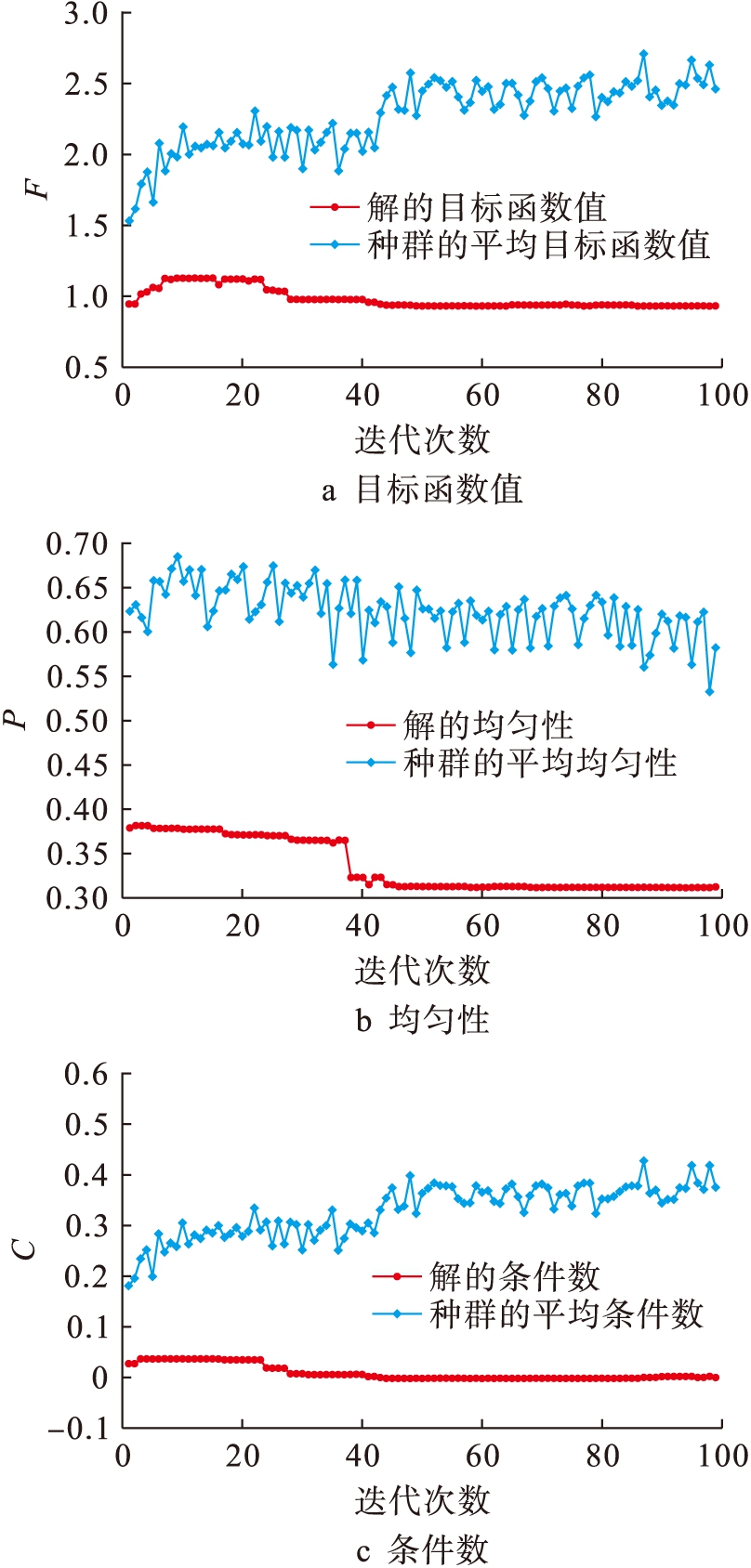 Fig.5 Changing curves of objective function value, condition number and uniformity