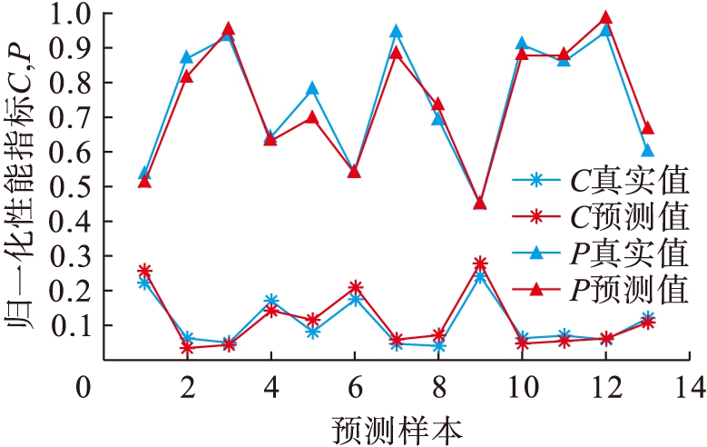 图4给出13组样本数据所对应的真实值和预测值.决定系数R2表示神经网络模型对观测值的拟合程度,P和C所对应的R2分别为0.923 27、0.937 91,拟合效果较好.