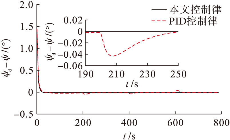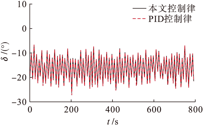 为验证所设计的船舶航向神经网络控制律的有效性,本文利用Matlab对其进行数值模拟,并与传统PID控制律的性能进行比较.采用文献[10]介绍的船舶作为被控对象进行仿真研究,该船的增益常数和时间常数分别为K=0.5 s-1和T=31 s,Norribin系数α=0.4 s2,这些参数的值都是船舶在航速U=5 m/s的情况下通过辨识得到的.在仿真中考虑船舶舵角的幅值限制,最大的舵角幅值为δmax=30°.采用文献[11]中的外界环境干扰模型参数g=9.8 m/s2,χ=π/6,ρ1=0.9,c1=5.6×103,c2=90,KB=3 500,其他综合干扰的等效舵角为δA=16°+2°sin(0.2t)+5°cos(0.5t).