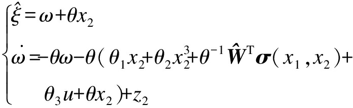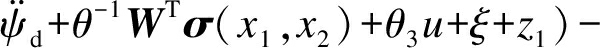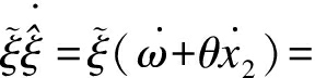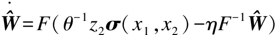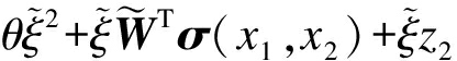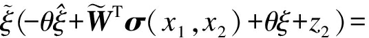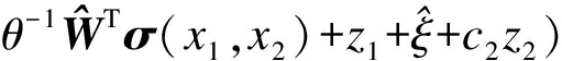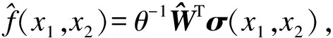 式中:θ>0为扰动观测器的设计参数;(x1,x2)为网络的输入信号;W=(w1,w2,…,wh)T为理想的权值系数;σ=(σ1,σ2,…,σh)T为高斯函数,有h个隐层节点;ε为神经网络的估计误差.未知项f(x1,x2)的估计表示为将式(13)代入式(12)可得