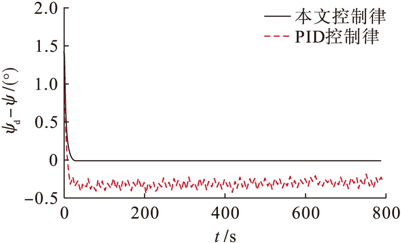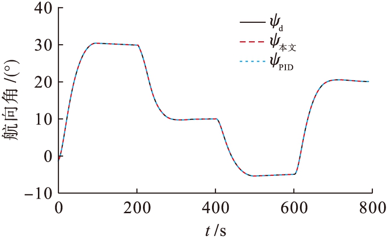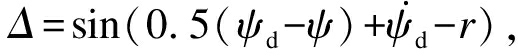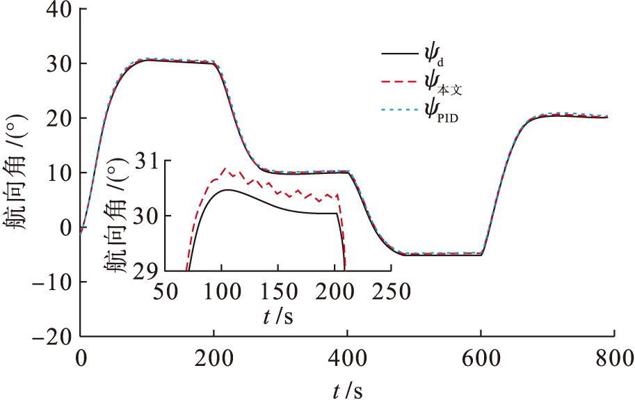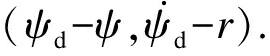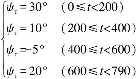 式中:ψr为航向改变的设定信号;ξψ和ωn为闭环系统的响应特性.参考模型(29)是设定信号ψr的预滤波,其响应特性应与船舶的响应特性相匹配,当设定信号ψr发生改变时,参考模型(29)可以产生光滑且有界的期望航向角ψd.本文参考模型中ξψ=0.8,ωn=0.05,船舶设定信号ψr为