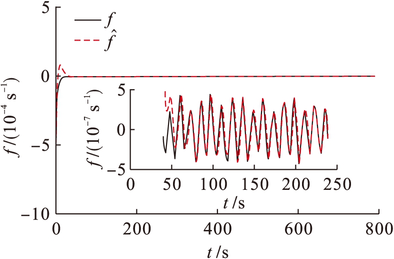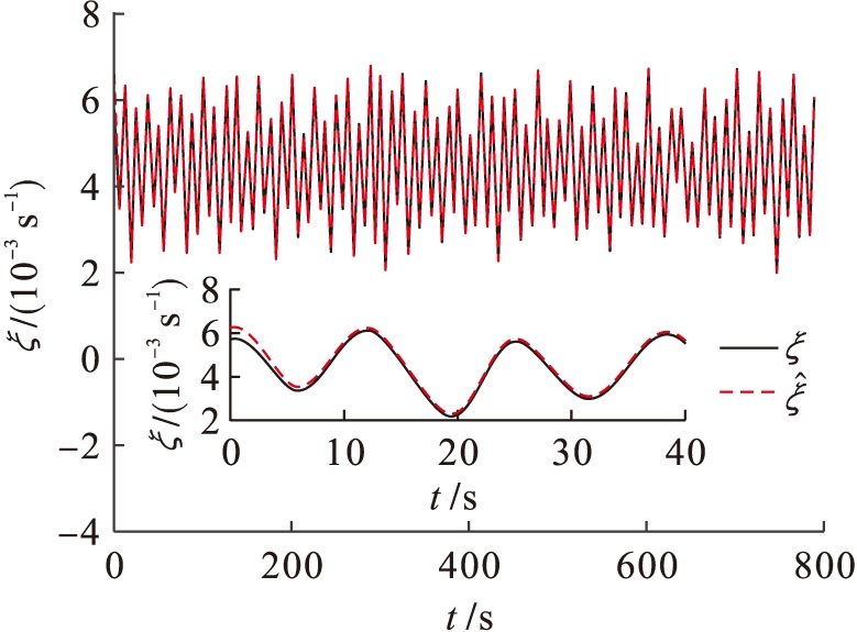 图6为控制舵角的响应曲线,本文控制律与PID控制律舵角曲线相差不大.图7为不确定项及其神经网络的逼近曲线,神经网络可在60 s左右实现不确定项的逼近.图8为扰动项及其估计曲线,由图8可知本文所设计的扰动观测器可在8 s左右实现干扰的估计.即使模型中存在不确定项以及外界干扰,本文所设计的自适应神经网络控制律可以使得船舶跟踪期望航向,验证了控制律的鲁棒性,而在控制参数不进行调整的情况下,PID控制律的航向误差曲线发生了波动,并存在稳态误差,进而说明了本文控制律的优越性.