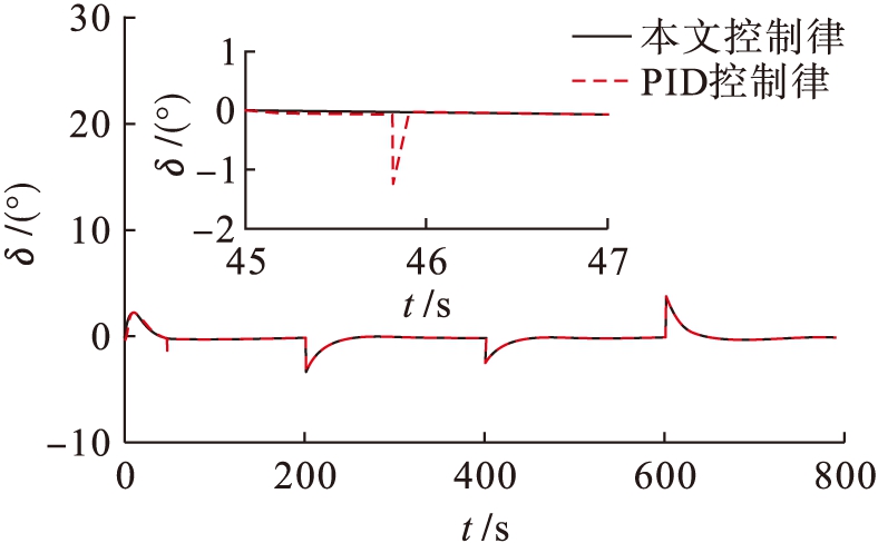 船舶操纵模型中存在不确定项以及外界干扰,在两种控制律参数不进行调整的情况下进行仿真研究,仿真结果如图4~8所示.