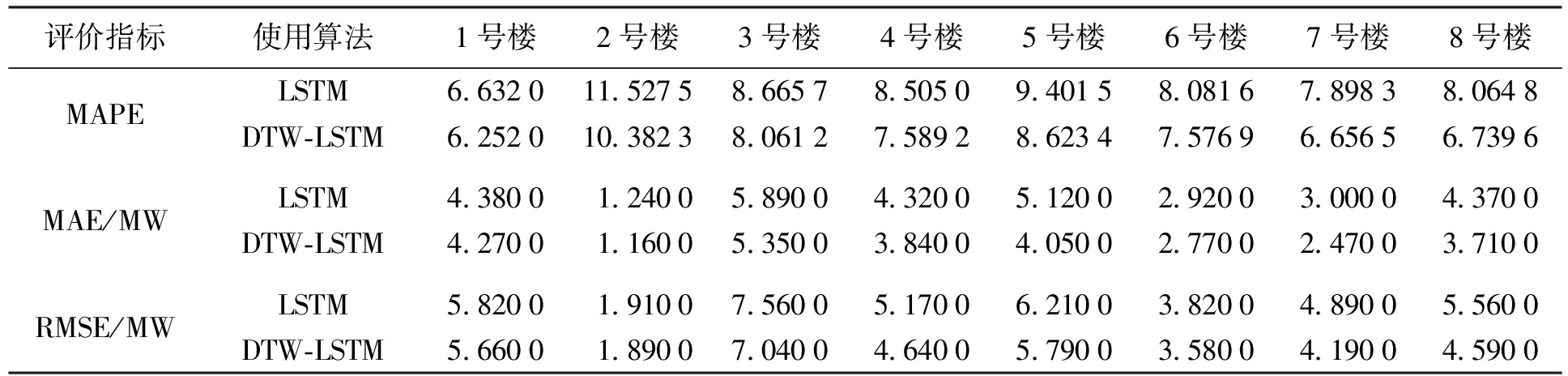 从表4中可以看出,DTW-LSTM模型对于各个楼宇的预测精度均有所提升.以MAPE指标为例,提升幅度最大值为1.325 2%,最小提升幅度为0.38%,平均提升幅度为0.861 3%.通过分析发现,8号楼中的日用电曲线的聚类结果较为分散,故编码对负荷预测的影响较大;而1号楼中的日用电曲线聚类结果几乎为同一个簇,编码对负荷产生的影响较小,符合最终的结果.