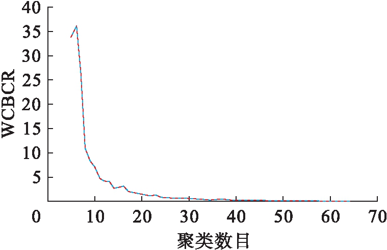 对于8个楼宇的日用电曲线数据,实验聚类数目为5~65簇.图3记录了不同聚类数目的WCBCR评价指标.