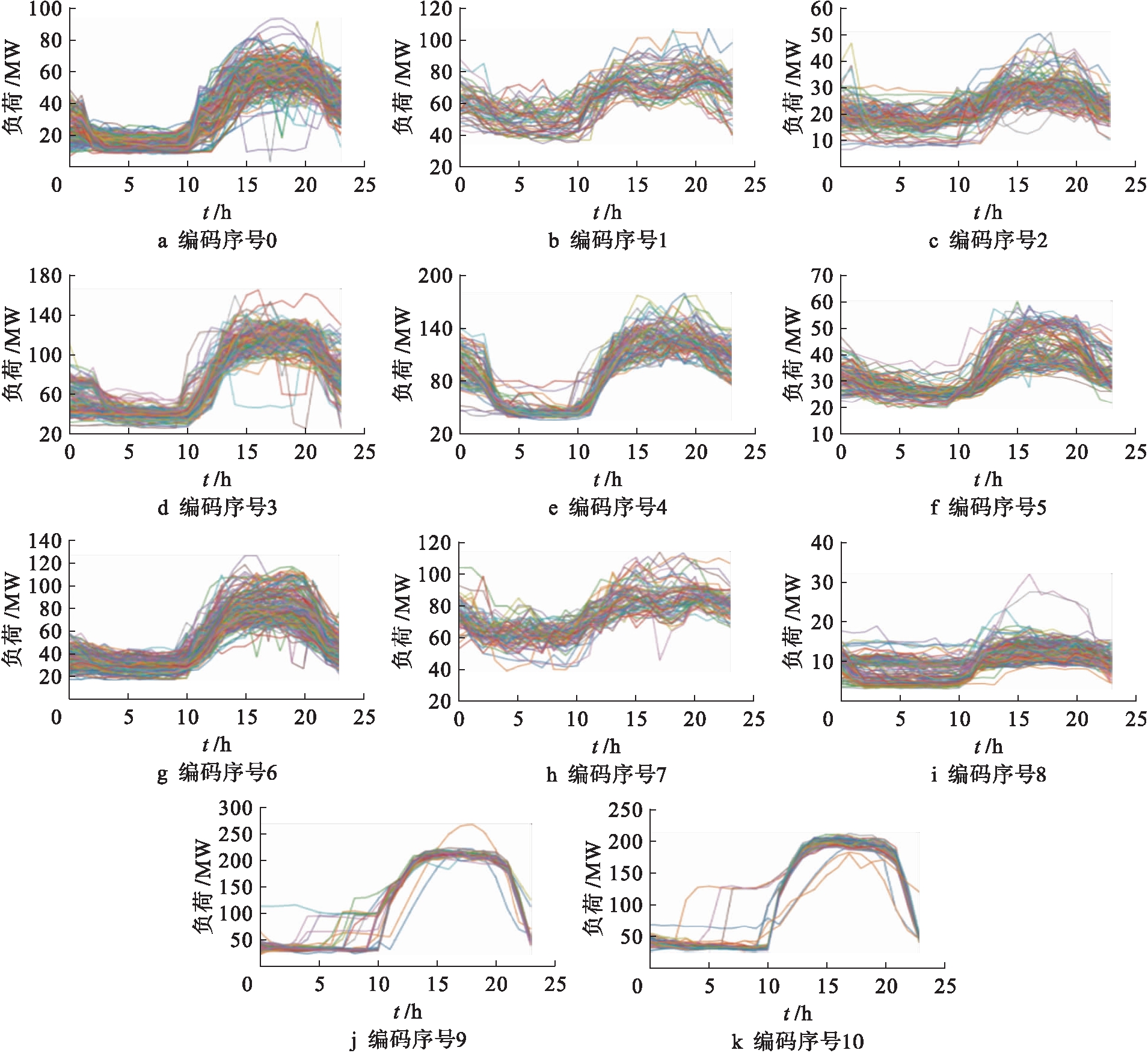 随着聚类数目增多,簇之间的距离之和变大,故WB的值增大;每个簇中曲线越来越紧凑,故WC的值减小.综合上述两点,WCBCR的值随着聚类数目增加逐渐减小.但在聚类数目11之前下降较快,而在聚类数目11之后下降较慢,根据拐点法选择聚类数目为11最佳.图4为最终的聚类结果,并对每个簇进行编码(0~10).