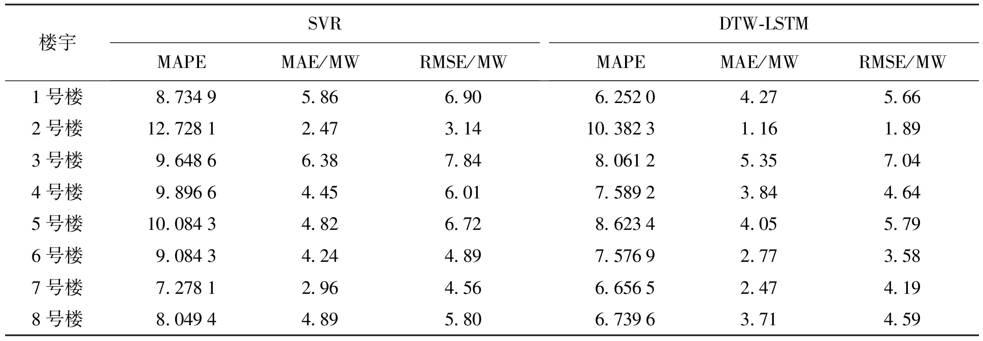 由表5中可以发现,DTW-LSTM模型在各性能指标方面均优于SVR模型,MAPE指标平均降低1.703%,MAE指标平均降低1.056 MW,RMSE指标平均降低1.06 MW,且模型具有泛化能力,对所有的楼宇具有普适性.因此在实际的应用中,DTW-LSTM模型完全能够胜任楼宇短期的负荷预测.