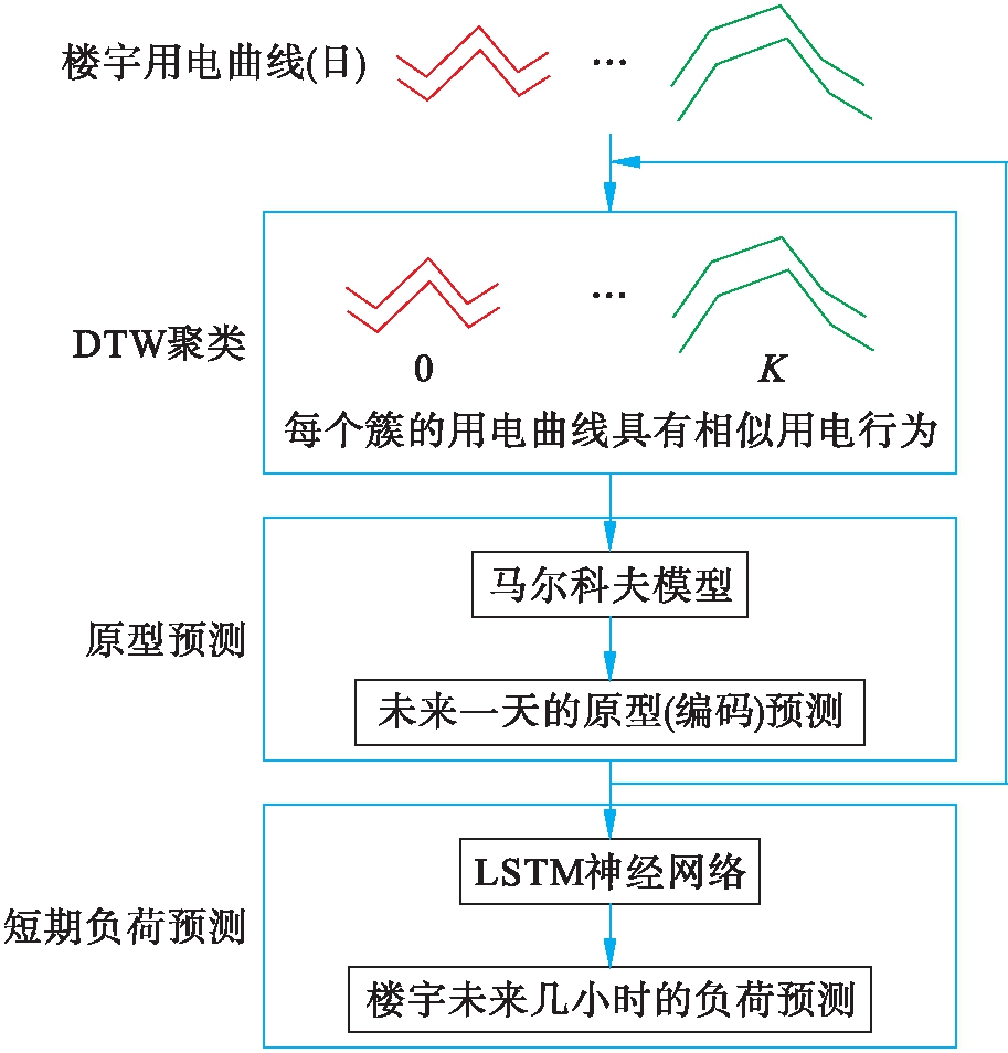 本文提出的整体网络结构如图2所示.模型主要包含3个部分,第1部分是对楼宇日用电曲线进行聚类,得到K簇并对簇编码(0~K-1);第2部分利用马尔科夫链模型预测楼宇的用电曲线编码,每个楼宇利用r天的用电编码预测第r+1天的用电编码,目的是为了得到r+1天的用电曲线原型;第3部分是对楼宇的短期负荷进行预测,将马尔科夫链预测的用电编码作为一个特征,结合历史负荷数据,利用LSTM进行短期的负荷预测.