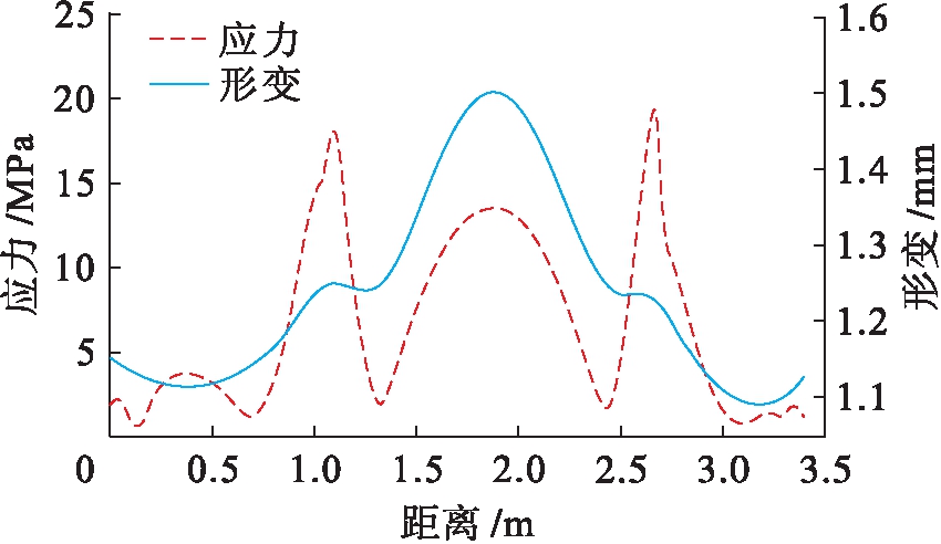 施工电源顶部横梁是受风荷载影响最大的位置,沿长度方向绘制横梁的应力和形变曲线如图8所示.从图8中可以看出,应力曲线具有3个峰值区域,分别对应变压器室顶部横梁约中点位置,以及两侧立柱顶部位置.3个峰值的产生原因不同,横梁中点处应力较大的主要原因在于:变压器室体积大、横梁长.横梁较大的形变也产生了较大的应力,而立柱顶部应力峰值产生的原因在于立柱与横梁连接处的集中应力.形变的峰值仅有一处,位于横梁中点位置.过大的形变将大幅度提高施工电源的密封难度,同时导致顶部盖板的严重变形.而立柱对减小形变有明显的作用,立柱采用了刚性较大的槽钢制成,有效地连接顶部与底面基座,抑制了形变.